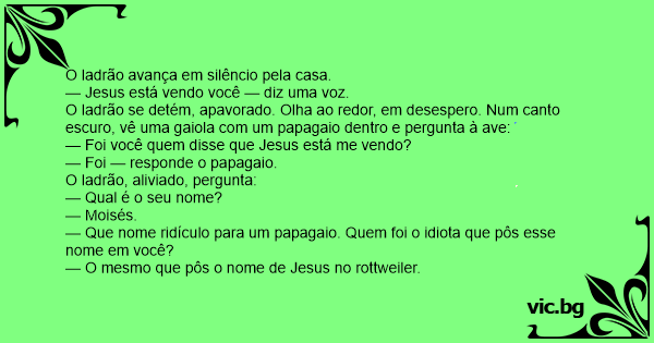 Um ladrão entra em uma casa e já vai logo roubando tudo,quando ouve: — Jesus tá te olhando. Ele olha a sua volta e como não vê nada continua roubando. Mas logo depois ouve de novo: — Jesus tá te...