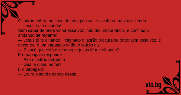 — Jesus té te olhando, indignado o ladrão procura de onde vem essa voz, e encontra, é um papagaio então o ladrão diz: