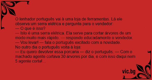 O lenhador português vai à uma loja de ferramentas. Lá ele observa um serra elétrica e pergunta para o vendedor:
