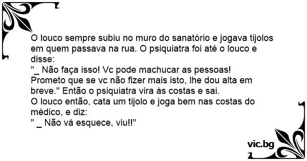 O louco sempre subiu no muro do sanatório e jogava tijolos em quem passava na rua. O psiquiatra foi até o louco e disse: