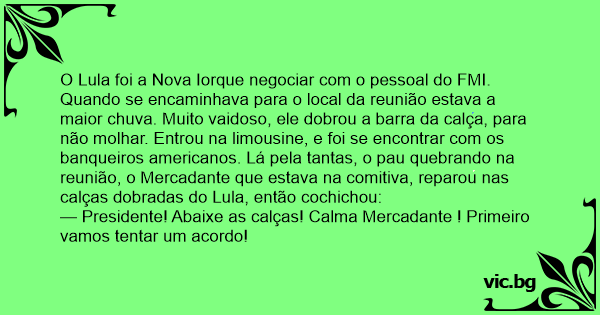 O Lula foi a Nova Iorque negociar com o pessoal do FMI. Quando se encaminhava para o local da reunião estava a maior chuva. Muito vaidoso, ele dobrou a barra da calça, para não molhar. Entrou na limousine, e foi se encontrar com os banqueiros americanos. Lá pela tantas, o раu quebrando na reunião, o Mercadante que estava na comitiva, reparou nas calças dobradas do Lula, então cochichou: