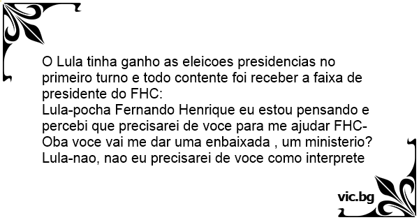 Lula-pocha Fernando Henrique eu estou pensando e percebi que precisarei de voce para me ajudar FHC-Oba voce vai me dar uma enbaixada , um ministerio?