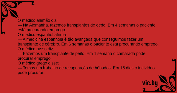 — Fazemos um transplante de peito. Em 1 semana o camarada pode procurar emprego.
