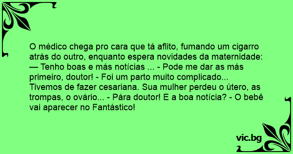 — Tenho boas e más notícias ... - Pode me dar as más primeiro, doutor! - Foi um parto muito complicado... Tivemos de fazer cesariana. Sua mulher perdeu o útero, as trompas, o ovário... - Pára doutor! E a boa notícia? - O bebê vai aparecer no Fantástico!