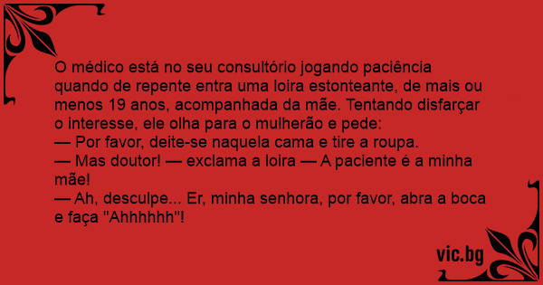 O médico está no seu consultório jogando paciência quando de repente entra uma loira estonteante, de mais ou menos 19 anos, acompanhada da mãe. Tentando disfarçar o interesse, ele olha para o mulherão e pede: