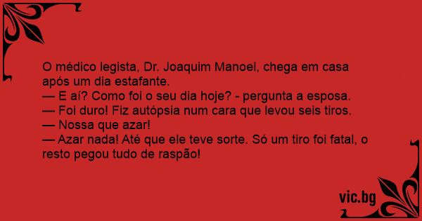— Azar nada! Até que ele teve sorte. Só um tiro foi fatal, o resto pegou tudo de raspão!