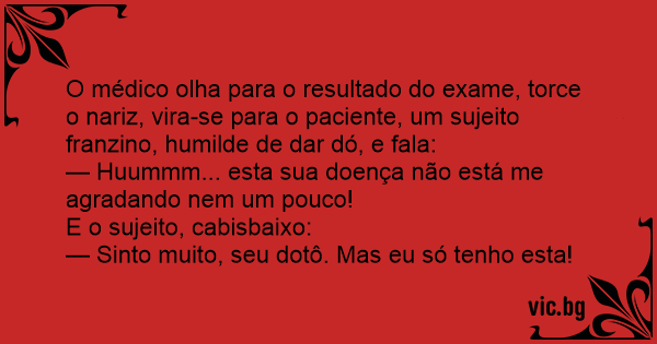 O médico olha para o resultado do exame, torce o nariz, vira-se para o paciente, um sujeito franzino, humilde de dar dó, e fala: