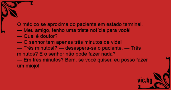 — Três minutos!? — desespera-se o paciente. — Três minutos? E o senhor não pode fazer nada?