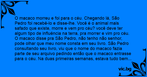 O macaco morreu e foi para o céu. Chegando lá, São Pedro foi recebê-lo e disse-lhe. Você é o animal mais safado que existe, morre e vem pro céu? você deve ter algum tipo de influência na terra, pra morrer e vim pro céu. O macaco disse pra São Pedro, não tenho não senhor, pode olhar que meu nome consta em seu livro. São Pedro consultando seu livro, viu que o nome do macaco fazia parte de seu arquivo pedindo então que o macaco entrasse para o céu. Na duas primeiras semanas, estava tudo bem calmo no céu, más, na terceira semana, estava a maior zоrrа. Macaco come o anjo da direita, macaco come o anjo da esquerda. São Pedro então castrou o macaco e o soltou. Na duas semanas seguintes ao castramento, estava tudo tranquilo no céu, más, na terceira semana, outra zоrrа. Macaco dá pra Santo Antônio, macaco dá pra São Benedito. São Pedro outra vez nervoso, pegou o macaco, virou sua bundinha e preparou uma agulha com linha para então costurar seu cú. O macaco diante dessa situação, olhou para São Pedro e disse-lhe: Olha, se costurar meu cú e eu irei сhuраr.