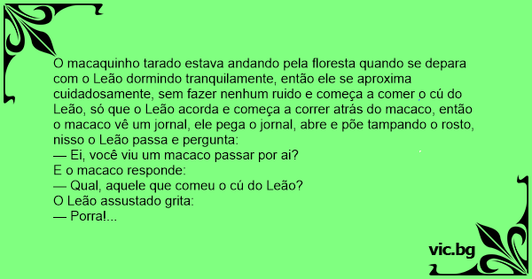 O macaquinho таrаdо estava andando pela floresta quando se depara com o Leão dormindo tranquilamente, então ele se aproxima cuidadosamente, sem fazer nenhum ruido e começa a comer o cú do Leão, só que o Leão acorda e começa a correr atrás do macaco, então o macaco vê um jornal, ele pega o jornal, abre e põe tampando o rosto, nisso o Leão passa e pergunta: