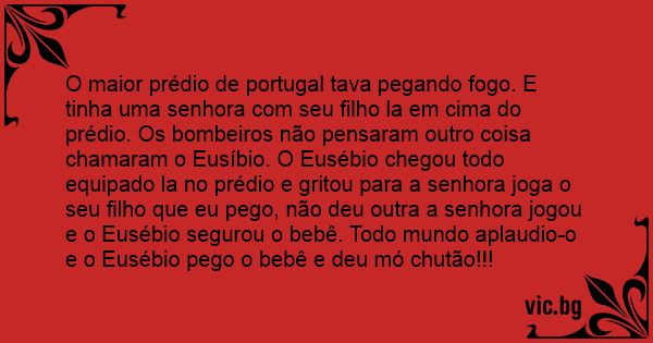 O maior prédio de portugal tava pegando fogo. E tinha uma senhora com seu filho la em cima do prédio. Os bombeiros não pensaram outro coisa chamaram o Eusíbio. O Eusébio chegou todo equipado la no prédio e gritou para a senhora joga o seu filho que eu pego, não deu outra a senhora jogou e o Eusébio segurou o bebê. Todo mundo aplaudio-o e o Eusébio pego o bebê e deu mó chutão!!!