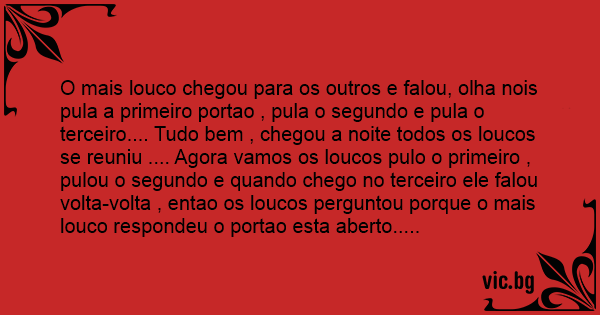 O mais louco chegou para os outros e falou, olha nois pula a primeiro portao , pula o segundo e pula o terceiro.... Tudo bem , chegou a noite todos os loucos se reuniu .... Agora vamos os loucos pulo o primeiro , pulou o segundo e quando chego no terceiro ele falou volta-volta , entao os loucos perguntou porque o mais louco respondeu o portao esta aberto.....