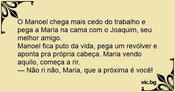 O Manoel chega mais cedo do trabalho e pega a Maria na cama com o Joaquim, seu melhor amigo.