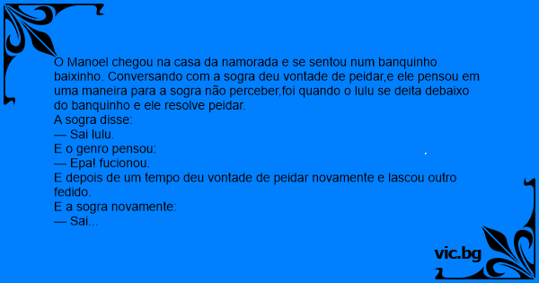 O Manoel chegou na casa da namorada e se sentou num banquinho baixinho. Conversando com a sogra deu vontade de peidar,e ele pensou em uma maneira para a sogra não perceber,foi quando o lulu se deita debaixo do banquinho e ele resolve peidar.