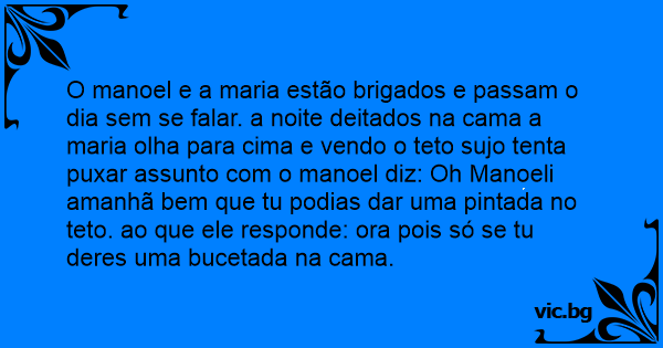 O manoel e a maria estão brigados e passam o dia sem se falar. a noite deitados na cama a maria olha para cima e vendo o teto sujo tenta puxar assunto com o manoel diz: Oh Manoeli amanhã bem que tu podias dar uma pintada no teto. ao que ele responde: ora pois só se tu deres uma bucetada na cama.