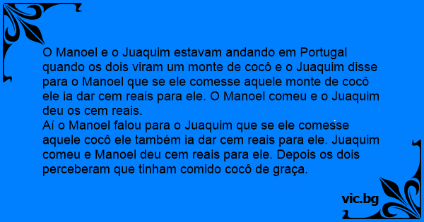 O Manoel e o Juaquim estavam andando em Portugal quando os dois viram um monte de cocô e o Juaquim disse para o Manoel que se ele comesse aquele monte de cocô ele ia dar cem reais para ele. O Manoel comeu e o Juaquim deu os cem reais.