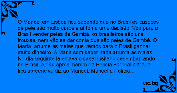 O Manoel em Lisboa fiса sabendo que no Brasil os casacos de pele são muito caros e aí toma uma decisão. Vou para o Brasil vender peles de Gambá, os brasileiros são uns trouxas, nem vão se dar conta que são peles de Gambá. Ô Maria, arruma as malas que vamos para o Brasil ganhar muito dinheiro. A Maria sem saber nada arruma as malas. No dia seguinte lá estava o casal lusitano desembarcando no Brasil. Ao se aproximarem da Polícia Federal a Maria fiса apreenciva diz ao Manoel. Manoel a Polícia Federal, vão descobrir que é contrabando, o que eu faço com os gambás? Põe nas calçinhas. A Maria. mas e o cheiro? Os gambás que se virem.