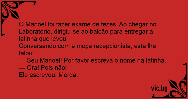 O Manoel foi fazer exame de fezes. Ao chegar no Laboratório, dirigiu-se ao balcão para entregar a latinha que levou.