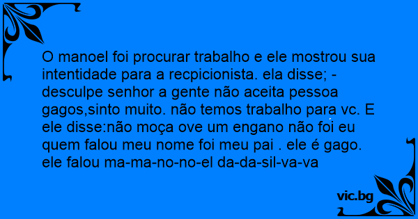 O manoel foi procurar trabalho e ele mostrou sua intentidade para a recpicionista. ela disse; -desculpe senhor a gente não aceita pessoa gagos,sinto muito. não temos trabalho para vc. E ele disse:não moça ove um engano não foi eu quem falou meu nome foi meu pai . ele é gago. ele falou ma-ma-no-no-el da-da-sil-va-va