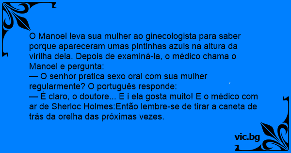 O Manoel leva sua mulher ao ginecologista para saber porque apareceram umas pintinhas azuis na altura da virilha dela. Depois de examiná-la, o médico chama o Manoel e pergunta: