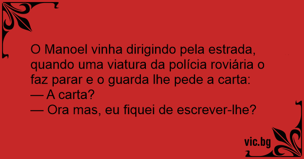 O Manoel vinha dirigindo pela estrada, quando uma viatura da polícia roviária o faz parar e o guarda lhe pede a carta: