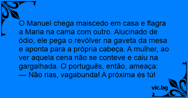 O Manuel chega maiscedo em casa e flagra a Maria na cama com outro. Alucinado de ódio, ele pega o revólver na gaveta da mesa e aponta para a própria cabeça. A mulher, ao ver aquela cena não se conteve e caiu na gargalhada. O português, então, ameaça: