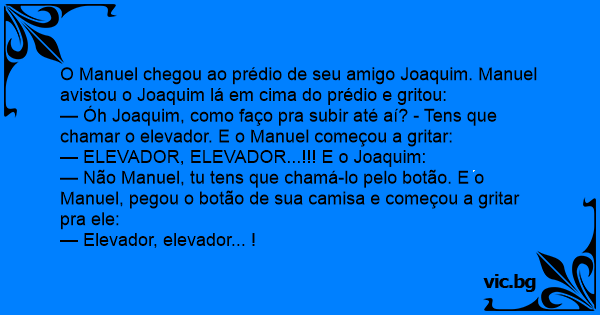 — Óh Joaquim, como faço pra subir até aí? - Tens que chamar o elevador. E o Manuel começou a gritar: