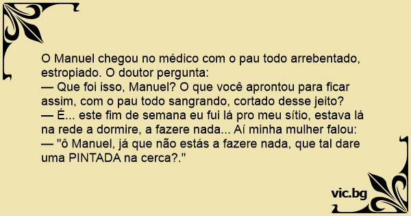 O Manuel chegou no médico com o раu todo arrebentado, estropiado. O doutor pergunta: