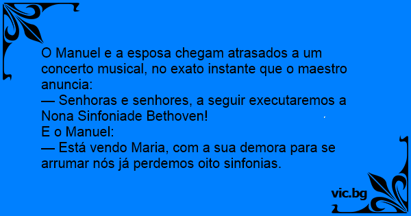 — Está vendo Maria, com a sua demora para se arrumar nós já perdemos oito sinfonias.