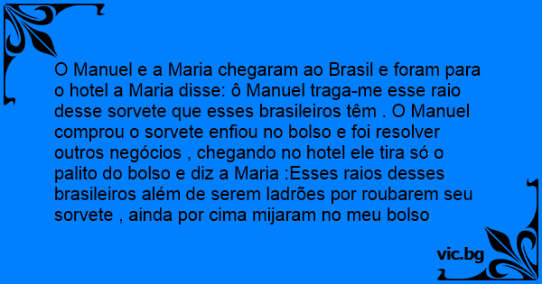O Manuel e a Maria chegaram ao Brasil e foram para o hotel a Maria disse: ô Manuel traga-me esse raio desse sorvete que esses brasileiros têm . O Manuel comprou o sorvete enfiou no bolso e foi resolver outros negócios , chegando no hotel ele tira só o palito do bolso e diz a Maria :Esses raios desses brasileiros além de serem ladrões por roubarem seu sorvete , ainda por cima mijaram no meu bolso
