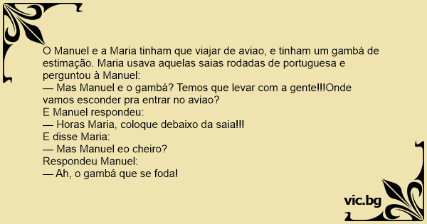 O Manuel e a Maria tinham que viajar de aviao, e tinham um gambá de estimação. Maria usava aquelas saias rodadas de portuguesa e perguntou à Manuel: