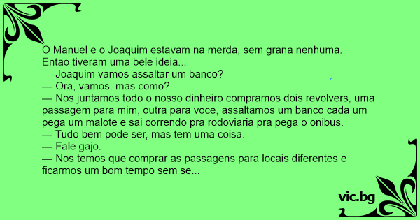 O Manuel e o Joaquim estavam na меrdа, sem grana nenhuma. Entao tiveram uma bele ideia... — Joaquim vamos assaltar um banco? — Ora, vamos. mas como? — Nos juntamos todo o nosso dinheiro compramos dois revolvers, uma passagem para mim, outra para voce, assaltamos um banco cada um pega um malote e sai correndo pra rodoviaria pra pega o onibus. — Tudo bem pode ser, mas tem uma coisa. — Fale gajo. — Nos temos que comprar as passagens para locais diferentes e ficarmos um bom tempo sem se ver. — Certo, entao vamos ficar 5 anos sem se falar pra ninguem desconfiar e apos os 5 anos agente se encontra na frente do bar do joao. ta? — Ta certo. Depois de terem comprado o material os dois foram para o assalto: — Isto e um assalto, todos no chao com as maos encima da cabeça. — E pode passando um malote pra ca mocinha. — Abram o cofre que eu vou pegar um malote de dentro do cofre. Pronto vamos. — Adeus Manuel. — Adeus Joaquim, ate o bar do joao. 5 anos depois na frente do bar do joao: — Joaquim porque voce esta todo esfarrapado feito um mendigo a policia pegou voce? — Naum. E voce se deu bem ehim, chegando de limosine com motorista e tudo. — Pois e, agora eu sou milionario. No malote que eu peguei tinham 8 milhoes de reais. E no seu? — No meu tinha 80 mil de nota promissoria pra paga, mas graças a deus terminei a ultima ontem.