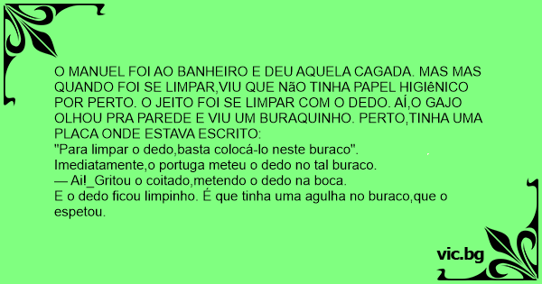 O MANUEL FOI AO BANHEIRO E DEU AQUELA CAGADA. MAS MAS QUANDO FOI SE LIMPAR,VIU QUE NãO TINHA PAPEL HIGIêNICO POR PERTO. O JEITO FOI SE LIMPAR COM O DEDO. AÍ,O GAJO OLHOU PRA PAREDE E VIU UM BURAQUINHO. PERTO,TINHA UMA PLACA ONDE ESTAVA ESCRITO: