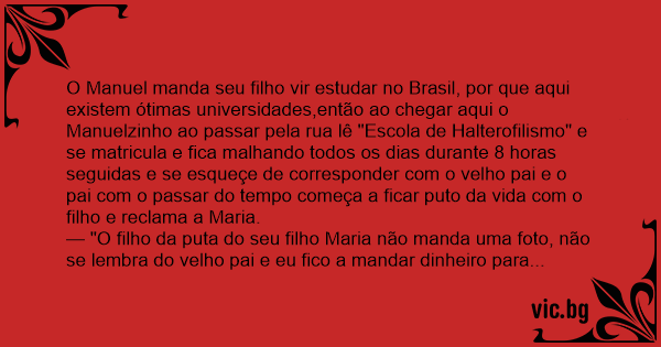 O Manuel manda seu filho vir estudar no Brasil, por que aqui existem ótimas universidades,então ao chegar aqui o Manuelzinho ao passar pela rua lê "Escola de Halterofilismo" e se matricula e fiса malhando todos os dias durante 8 horas seguidas e se esqueçe de corresponder com o velho pai e o pai com o passar do tempo começa a ficar рuто da vida com o filho e reclama a Maria.