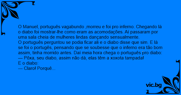 O Manuel, português vаgавundо ,morreu e foi pro inferno. Chegando lá o diabo foi mostrar-lhe como eram as acomodações. Aí passaram por uma sala cheia de mulheres lindas dançando sensualmente.