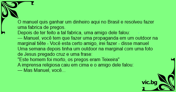 — Manuel, você tem que fazer uma propaganda em um outdoor na marginal tiête - Você esta certo amigo, irei fazer - disse manuel Uma semana depois tinha um outdoor na marginal com uma foto de Jesus pregado cruz e uma frase: