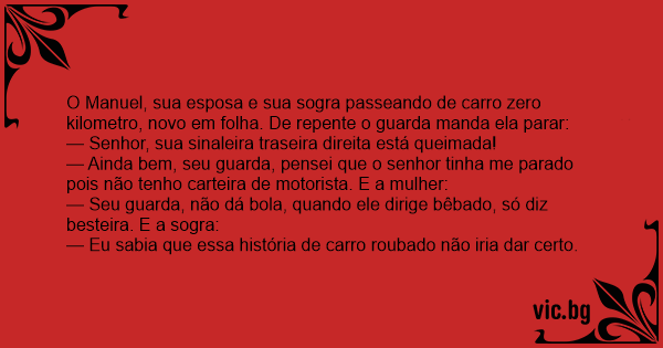 O Manuel, sua esposa e sua sogra passeando de carro zero kilometro, novo em folha. De repente o guarda manda ela parar: