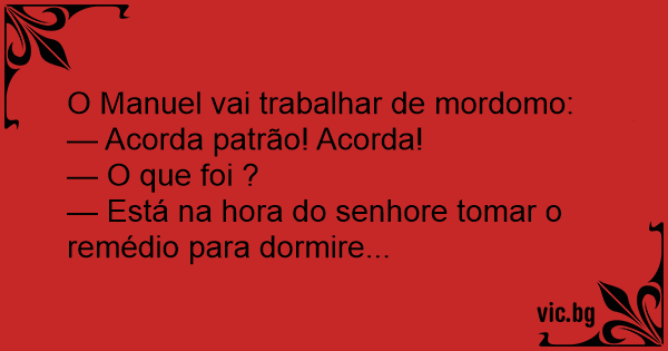 O portuga foi trabalhar de mordomo. Alguns dias depois, chegou pro patrão: — Patrão! Patrão! Acorde depressa! — Que foi? - perguntou ele, meio tonto com o sono ainda. — Acorde, patrão! Tá na hora...