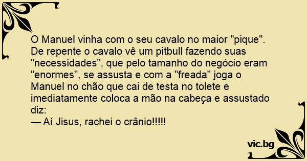 O Manuel vinha com o seu cavalo no maior "pique". De repente o cavalo vê um pitbull fazendo suas "necessidades", que pelo tamanho do negócio eram "enormes", se assusta e com a "freada" joga o Manuel no chão que cai de testa no tolete e imediatamente coloca a mão na cabeça e assustado diz: