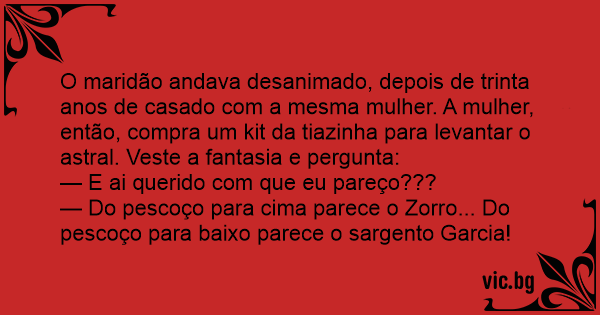 O maridão andava desanimado, depois de trinta anos de casado com a mesma mulher. A mulher, então, compra um kit da tiazinha para levantar o astral. Veste a fantasia e pergunta: