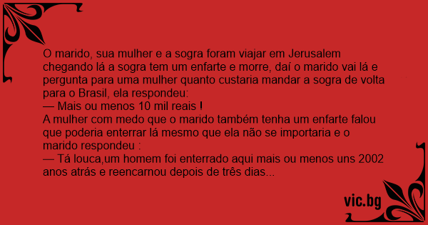 O marido, sua mulher e a sogra foram viajar em Jerusalem chegando lá a sogra tem um enfarte e morre, daí o marido vai lá e pergunta para uma mulher quanto custaria mandar a sogra de volta para o Brasil, ela respondeu: