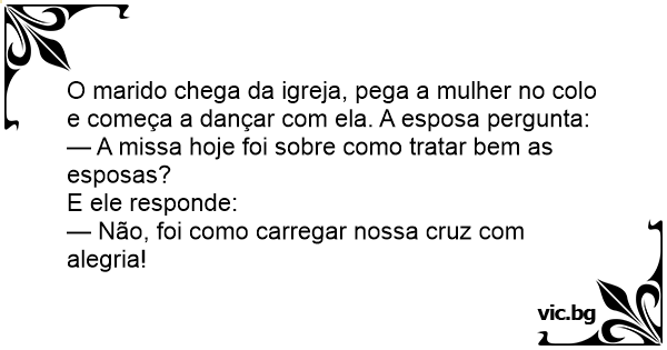 O marido chega da igreja, pega a mulher no colo e começa a dançar com ela. A esposa pergunta: