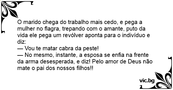 O marido chega do trabalho mais cedo, e pega a mulher no flagra, trepando com o amante, рuто da vida ele pega um revólver aponta para o indivíduo e diz: