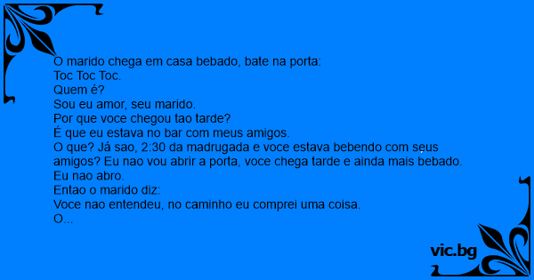 Entao o marido entra, pega uma cerveja na geladeira, se debruça no sofa e liga a T. V. A mulher entao questiona: