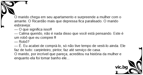 O marido, por incrível que pareça, acreditou na história da mulher e enquanto ela foi tomar banho ele ficou olhando pro suposto "andróide" e pensou: