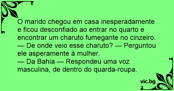 Il marito torna a casa prima del solito orario e trova un sigaro acceso nel portacenere. Si insospettisce e chiede alla moglie: "Da dove viene questo sigaro?" Segue un breve silenzio e poi dall'armadio una voce maschile e tremante risponde: "Da Cuba!"