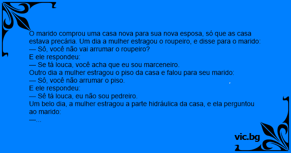 O marido comprou uma casa nova para sua nova esposa, só que as casa estava precária. Um dia a mulher estragou o roupeiro, e disse para o marido: