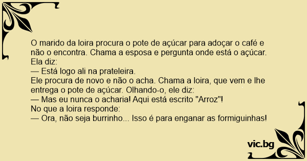 O marido da loira procura o pote de açúcar para adoçar o café e não o encontra. Chama a esposa e pergunta onde está o açúcar. Ela diz: