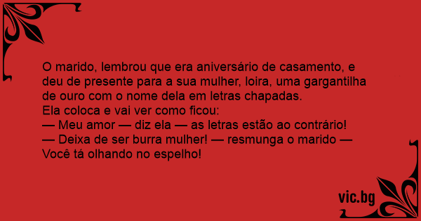 — Deixa de ser burra mulher! — resmunga o marido — Você tá olhando no espelho!