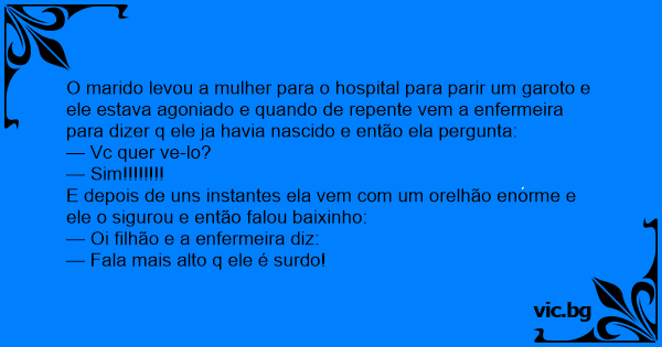 O marido levou a mulher para o hospital para parir um garoto e ele estava agoniado e quando de repente vem a enfermeira para dizer q ele ja havia nascido e então ela pergunta: